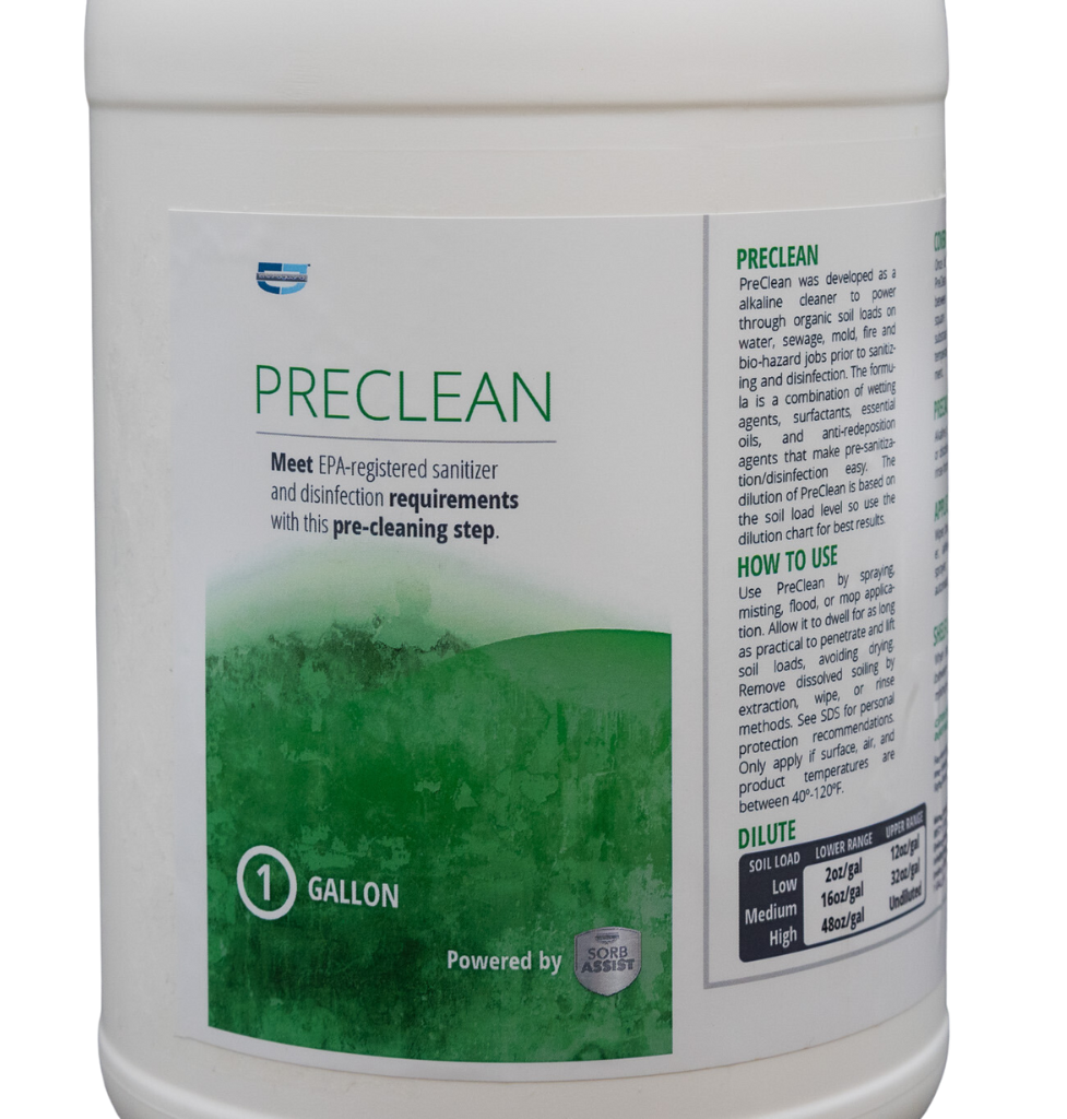 PreClean was developed as a concentrated, alkaline cleaner to power through organic soil loads on water, sewage, mold, fire and bio-hazard jobs prior to sanitizing and disinfection. The formula is a combination of wetting agents, surfactants, anti-redeposition agents, and essential oils for pre-sanitization/disinfection cleaning of porous, semi-porous and non-porous surfaces.